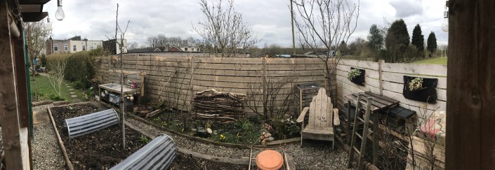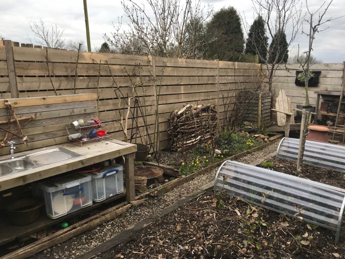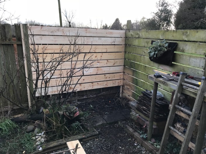 The first job was the clearance, which took a while as there were lots of bug houses, log stacks and fruit bushes against the old fence. Everything got cleared onto the veg bed behind.