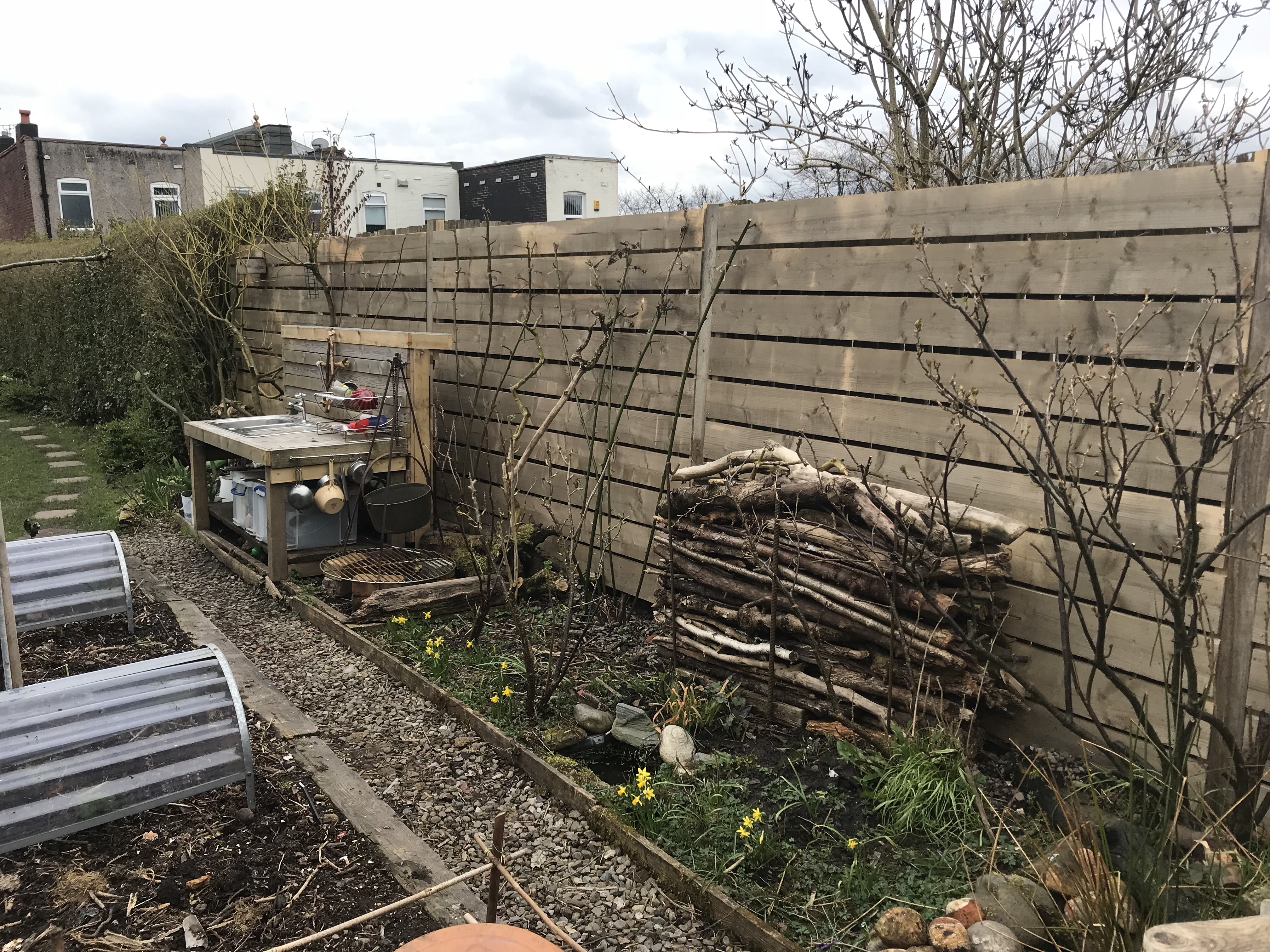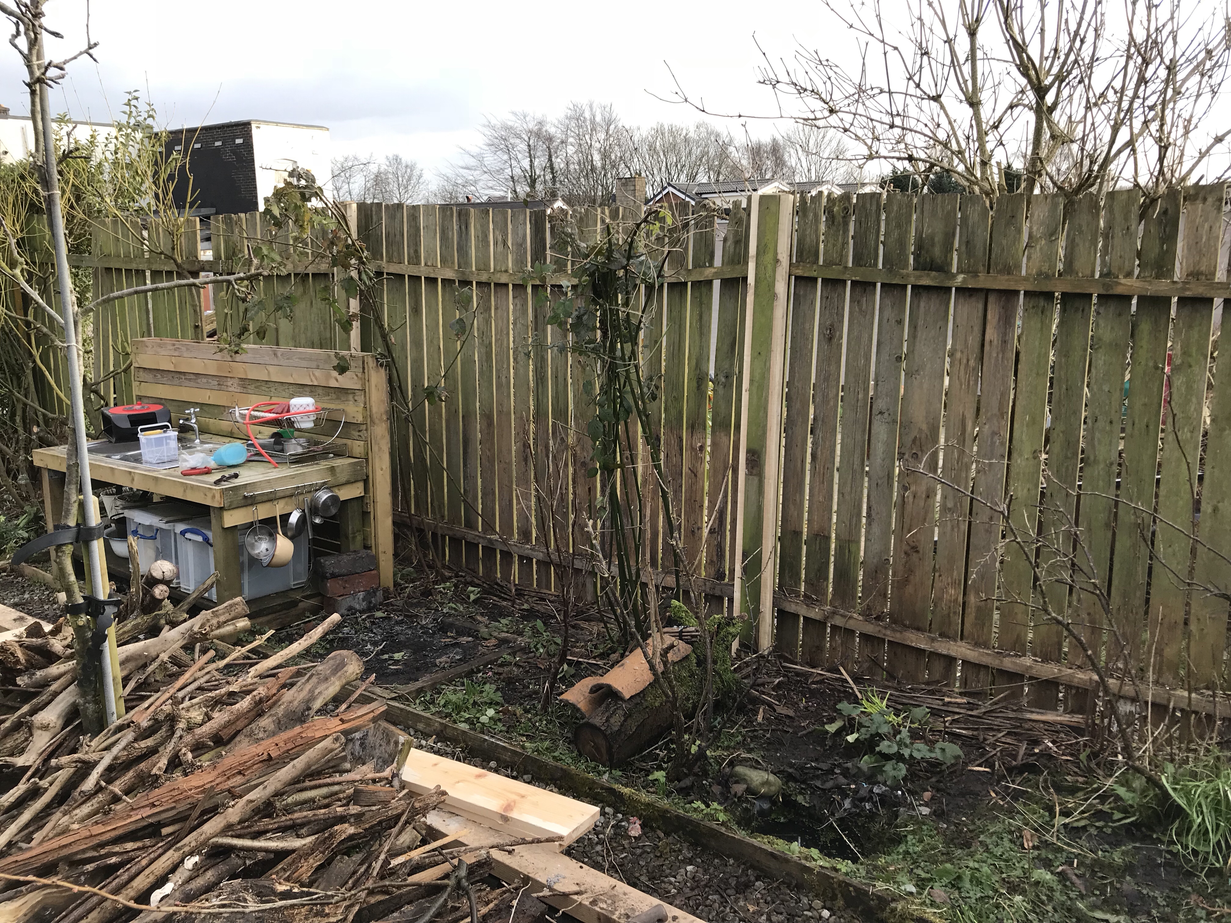 The first job was the clearance, which took a while as there were lots of bug houses, log stacks and fruit bushes against the old fence. Everything got cleared onto the veg bed behind.