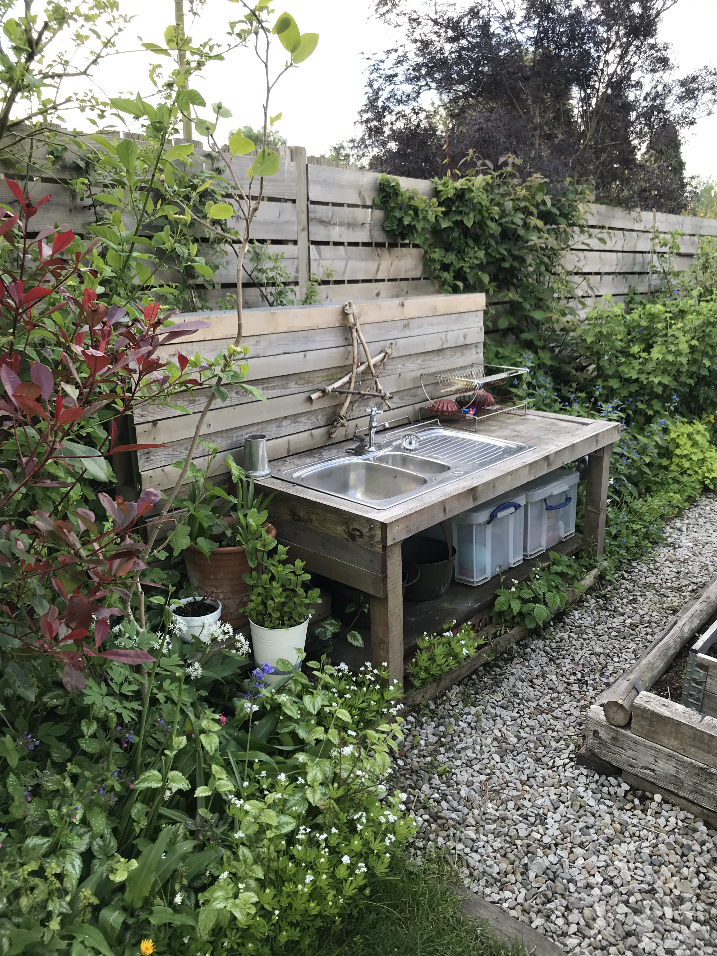 Sometimes I need a prod, especially when I’ve been so pleased with a part of the garden that I’ve not noticed when, actually, it no longer works. It happened with the bivouwac as I stubbornly resisted calls for it to go, first by Katie then the boys. I was convinced that my vision of a philadelphus clad den was best, despite the fact that it was too small and damp to be of any use. One day, annoyed at the latest dissenting comment I knocked the whole thing down, recycling the wood into other parts of the garden to form log piles and frog hides. In it’s place we put a fire pit and woodland area, with logs to sit on and oaks in pots mixed in with ferns. Not only did it look a million times better, but we all used the area too. I was wrong.